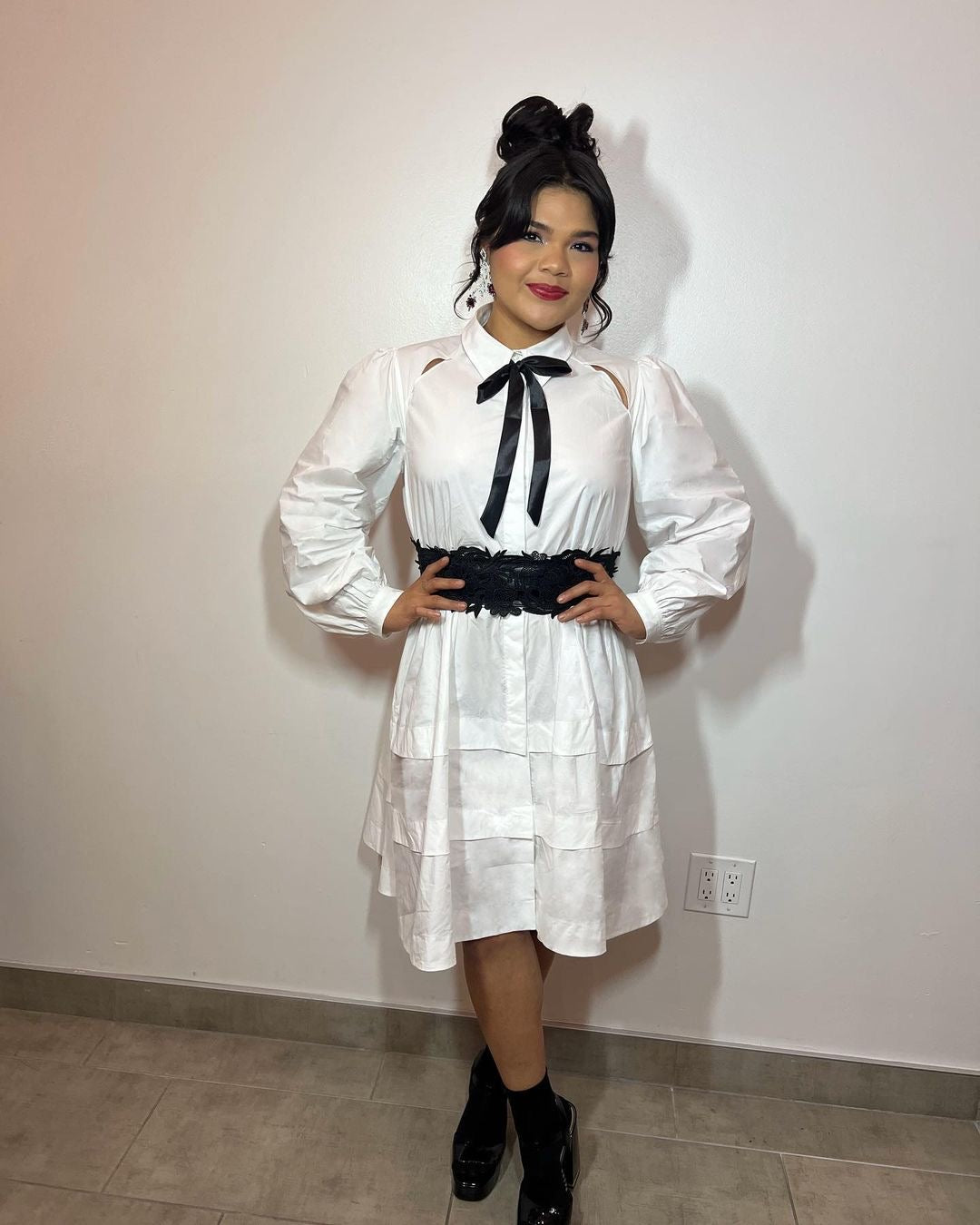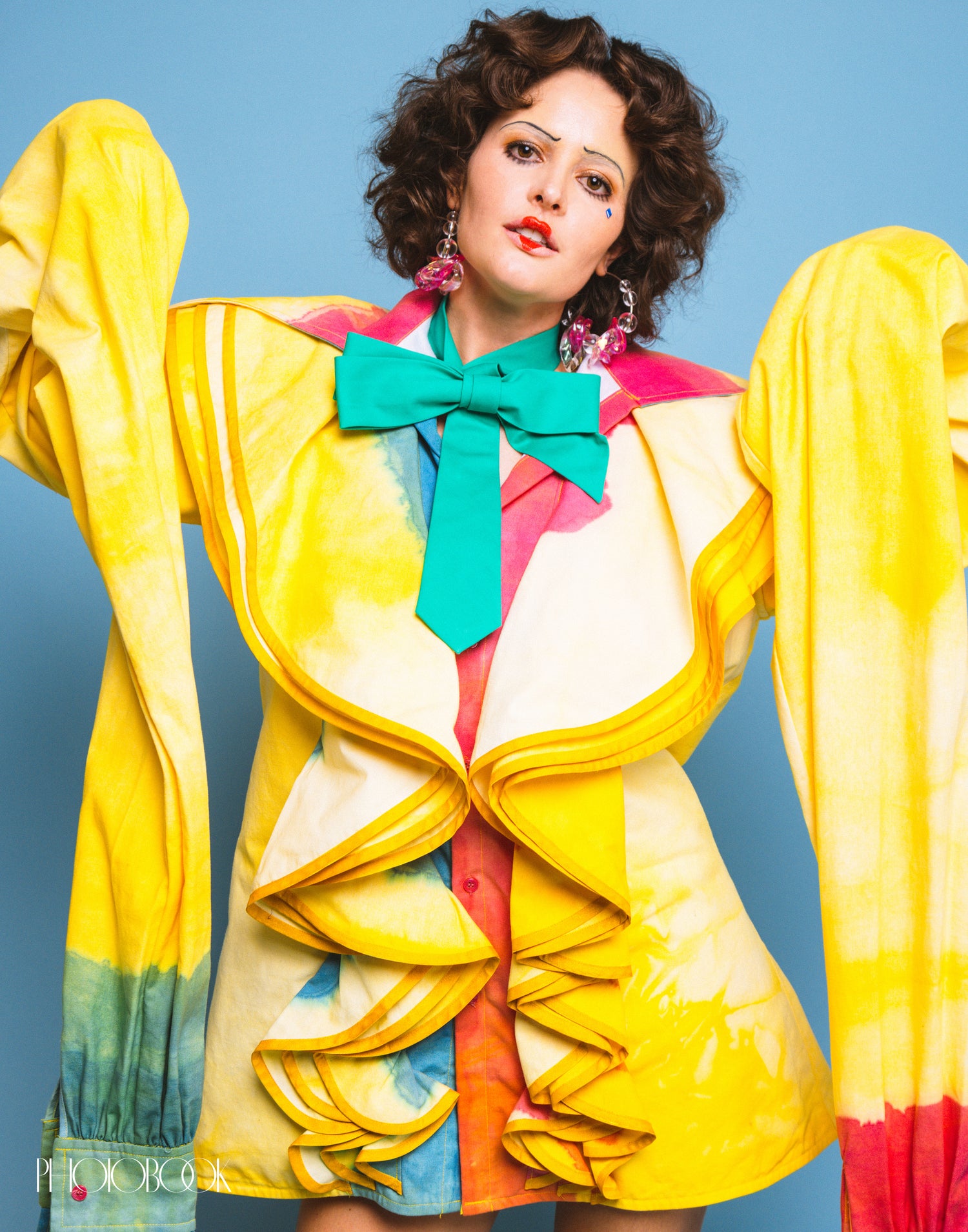 Designers:Multicolor Ruffled Button-Down Dress by Subin Hahn @subinhahnofficial Barbie Earrings by GAUDESS at Flying Solo @gaudess @flyingsolonyc The Emerald Green Grace Bow by NANDANIE at Flying Solo @nandanieofficial @flyingsolonyc Shoes by Stuart Weitzman @stuartweitzman